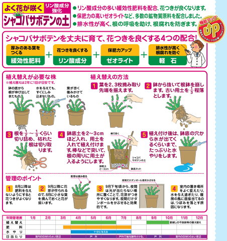 特徴 シャコバサボテンを丈夫に育て、花つきを良くする4つの配合! 厚みのある葉 をつくる + 花つきを良くする + 保肥力アップ + 排水性が高く 根腐れを防ぐ 緩効性肥料 リン酸成分 ゼオライト 軽石 植え方と管理 ◆植え替えが必要な株◆ ※植え替えは2年に1回が目安です。